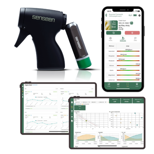 Le Nutriscope est un spectromètre qui fournit des mesures clés sur la santé de la culture (stress et teneurs en minéraux) en direct et au champ, en scannant les feuilles sans avoir à les prélever.